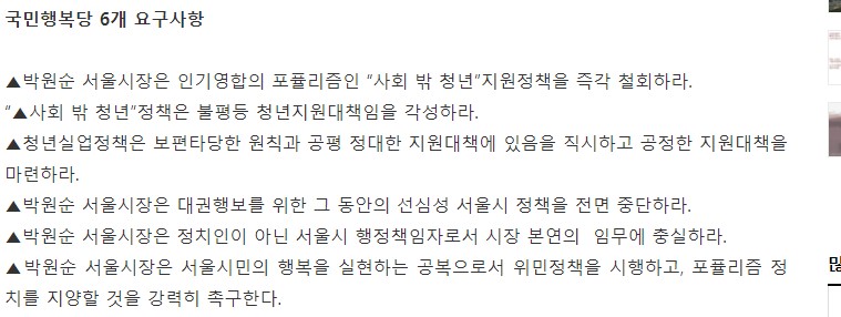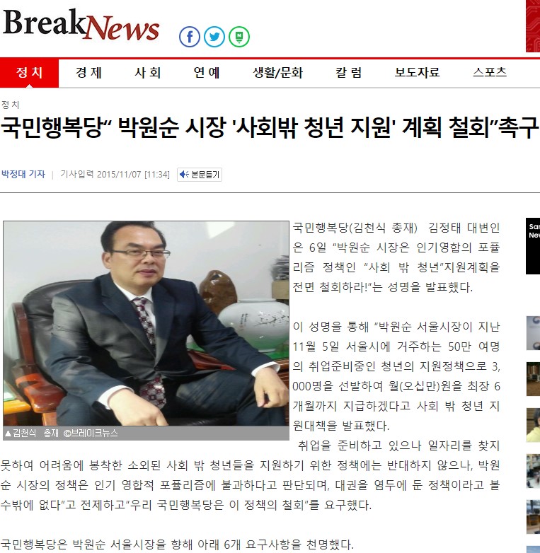 2015.11.07. [뉴스] [브레이크뉴스] 국민행복당“ 박원순 시장 '사회밖 청년 지원' 계획 철회”촉구