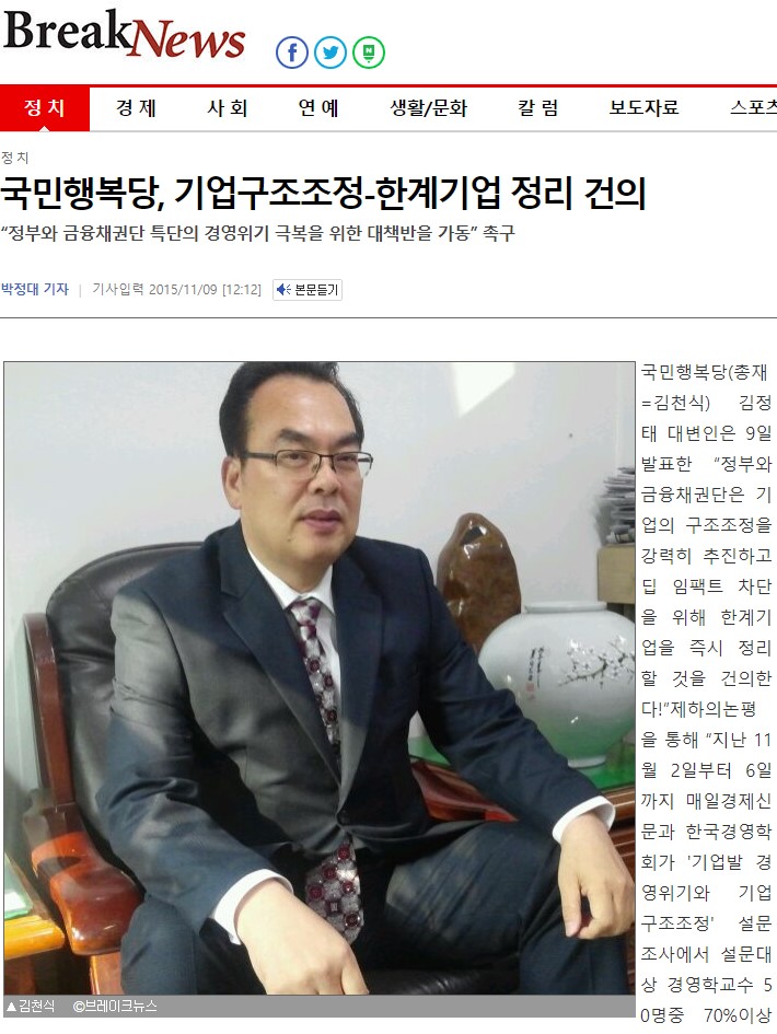 2015.11.09. [뉴스] [브레이크뉴스] 국민행복당, 기업구조조정-한계기업 정리 건의