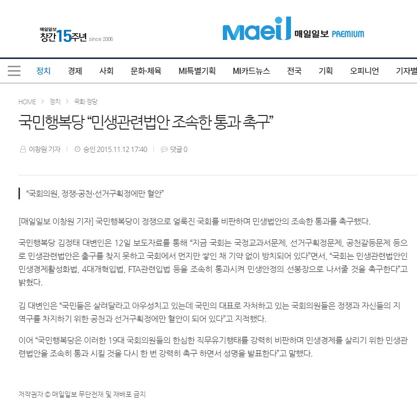 2015.11.12. [뉴스] [매일일보] 국민행복당 민생관련법안 조속한 통과 촉구