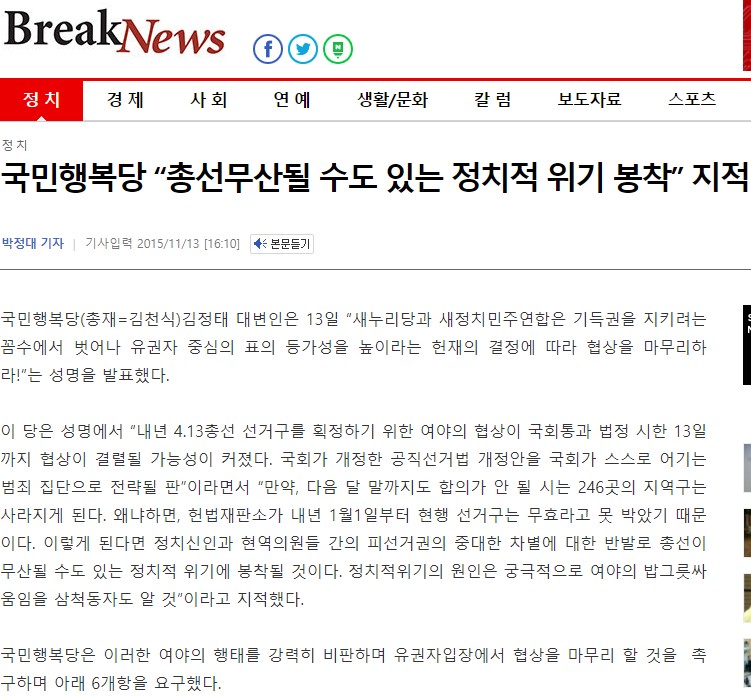 2015.11.13. [뉴스] [브레이크뉴스] 국민행복당 “총선무산될 수도 있는 정치적 위기 봉착” 지적
