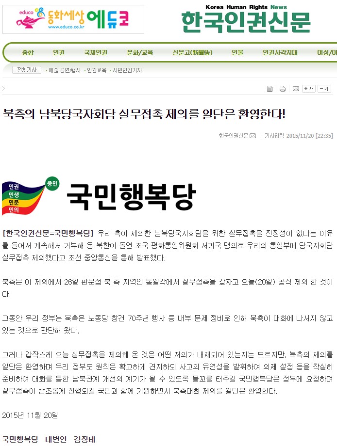 2015.11.20. [뉴스] [한국인권신문] 북측의 남북당국자회담 실무접촉 제의를 일단은 환영한다!