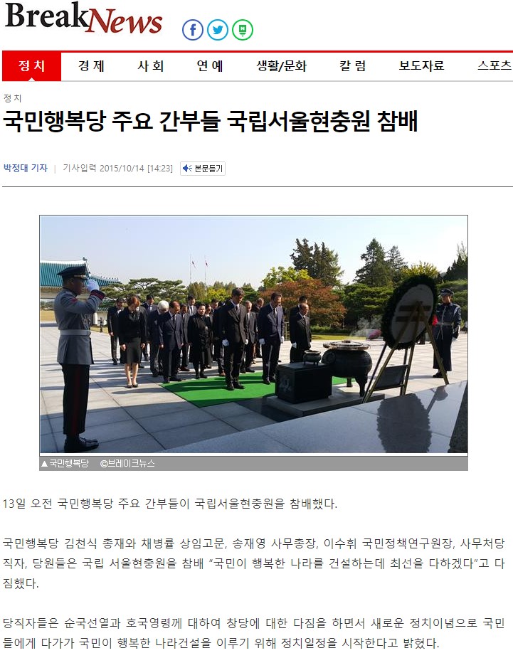 2015.10.14. [뉴스] [천지일보] 국민행복당 창당 ‘국립서울현충원 참배’로 정치일정 시작