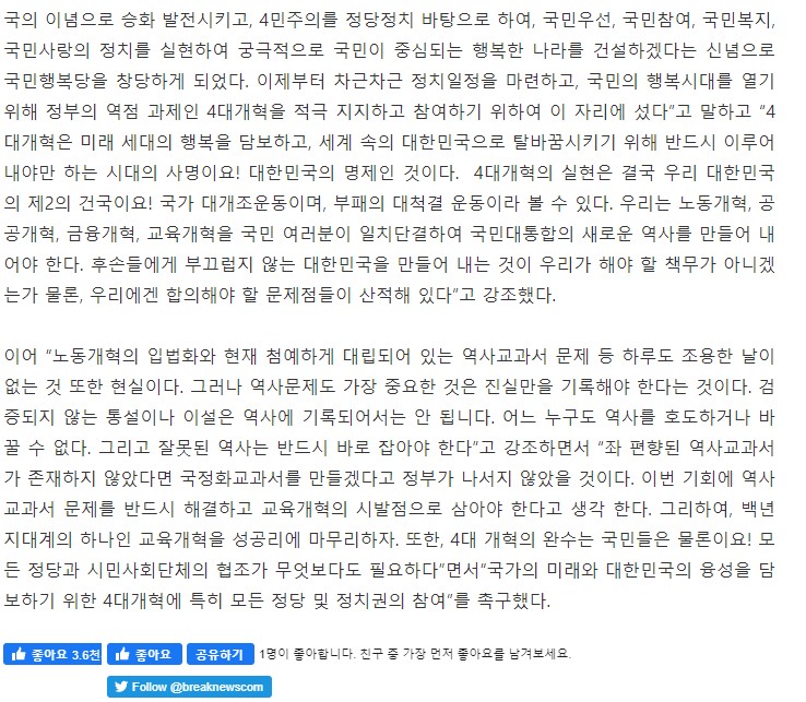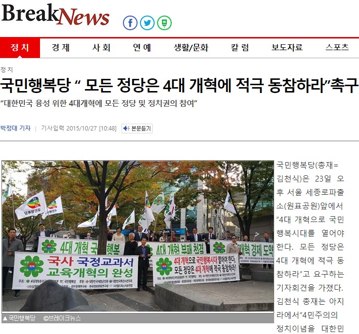 2015.10.27. [뉴스] [브레아크뉴스] 국민행복당 모든 정당은 4대 개혁에 적극 동참하라! 촉구