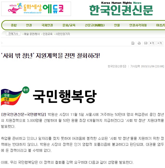 2015.11.06. [뉴스] [한국인권신문] '사회 밖 청년' 지원계획을 전면 철회하라!