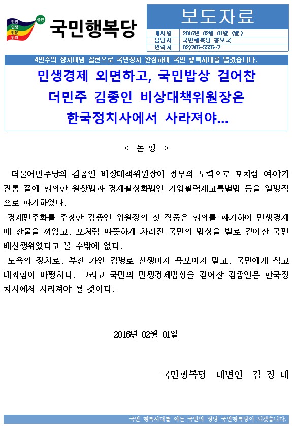 _국민행복당___김종인_더민주_비상대책위원장_논평__2016.02._01__보도자료[1].hwp