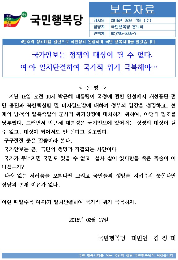 2016.02.17. [논평]국가안보는 정쟁의 대상이 될 수 없다. 여‧야 일치단결하여 국가적 위기 극복해야…