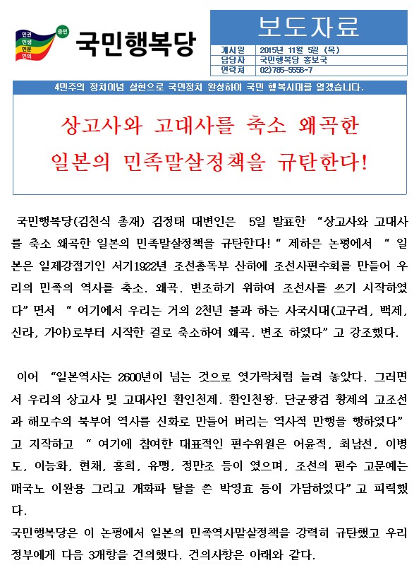 2015.11.05. [성명서]일본의 상고사-고대사 축소왜곡 민족말살정책 규탄 - 배포용.hwp