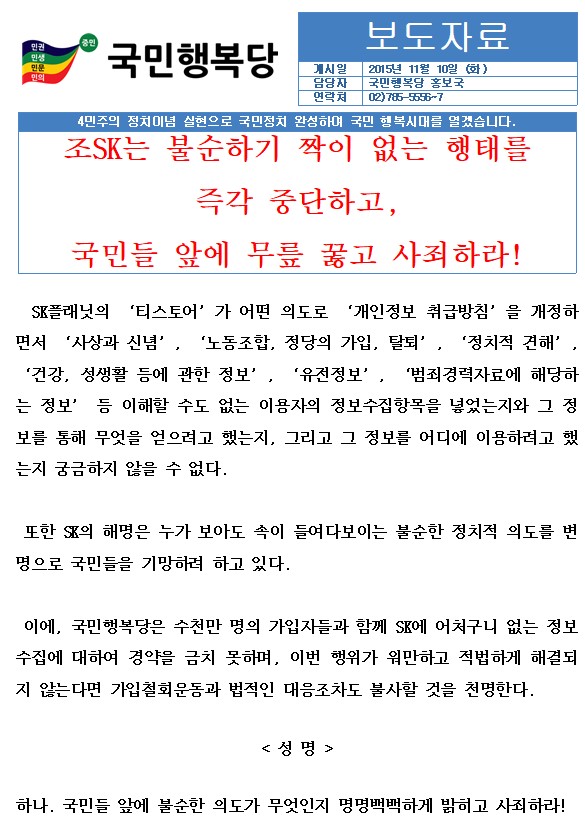 2015.11.10. [성명서] SK는 불순하기 짝이 없는 행태를 즉각 중단하고, 국민들 앞에 무릎 꿇고 사죄하라