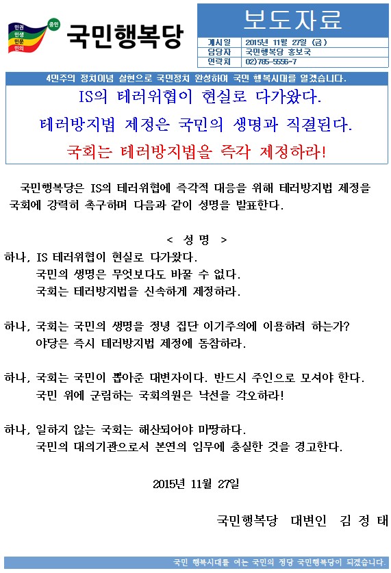 국민행복당____테러방지법_제정_촉구_성명서__2015.11._27__보도자료.hwp